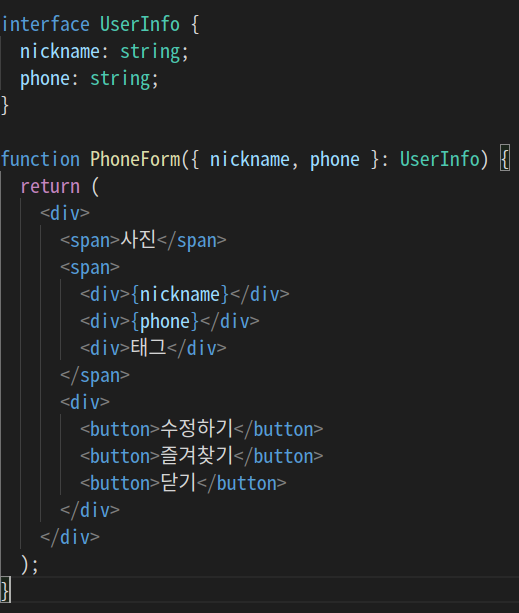 그리고 PhoneList의 자식 component로 PhoneForm을 지정해주었기에 여기에 데이터를 넘겨주었고, PhoneForm에서 데이터를 받기 위해서 PhoneForm에서 type들을 지정해주었다.