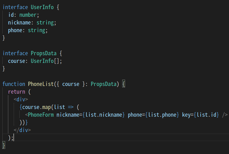 *UserInfo에서 객체 형태에 key값과 value의 type을 설정해주고, PropsData에서 course키에 빈배열에 객체형태로 들어오는 Type을 지정했다.