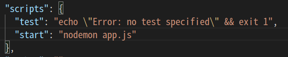 "start" : "node app.js" 을 설정 해주면 npm start로 손쉽게 서버를 열 수 있다.