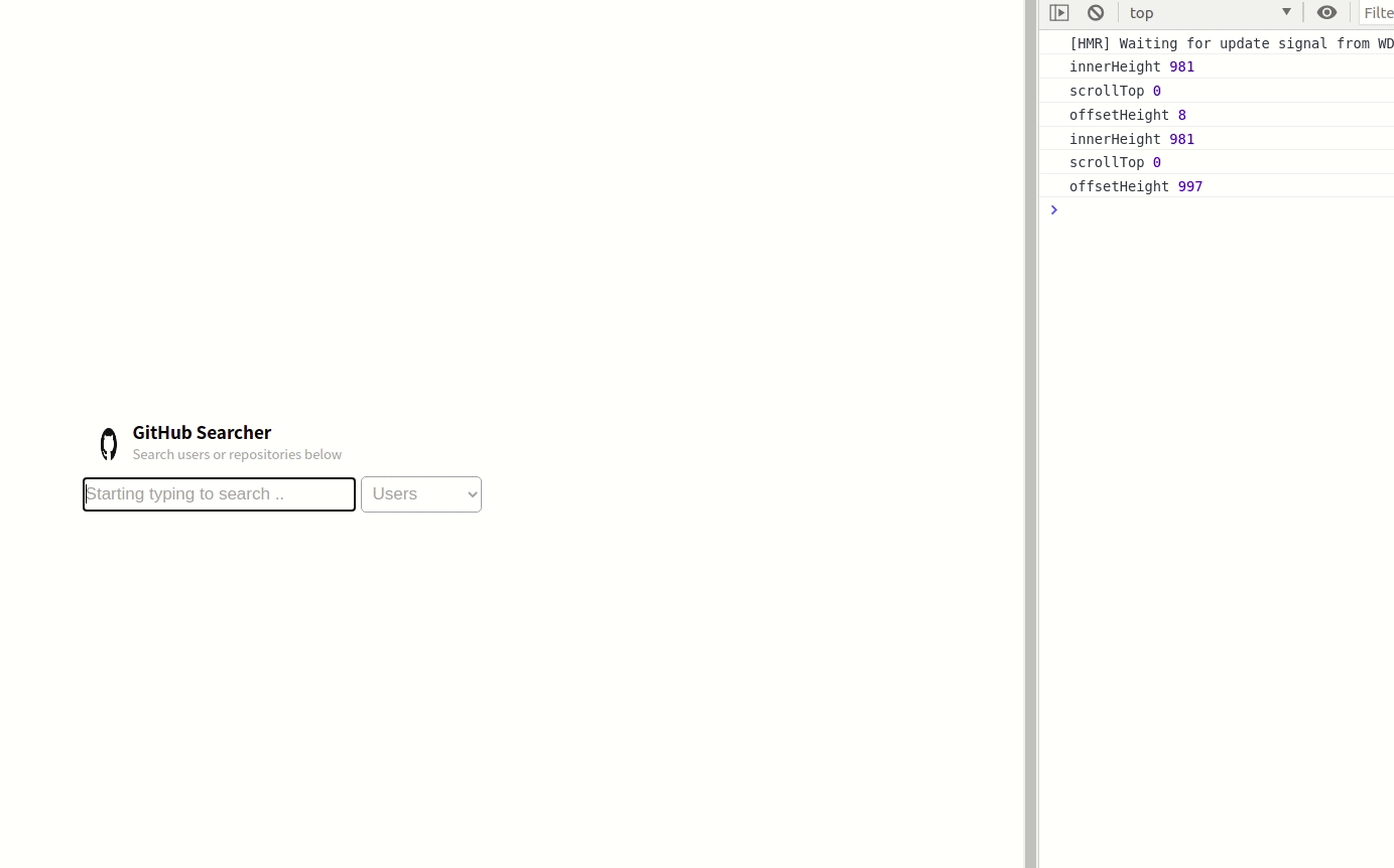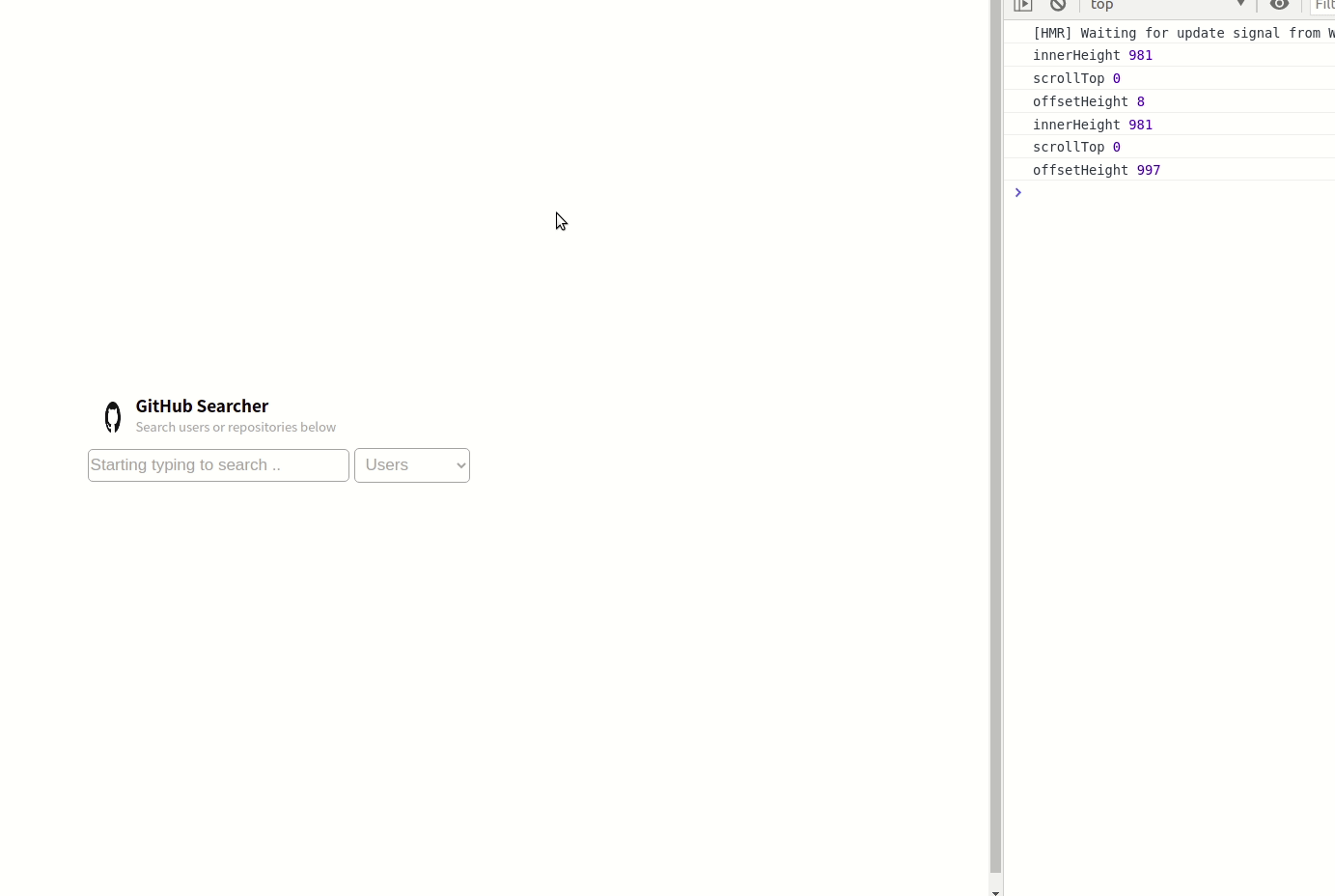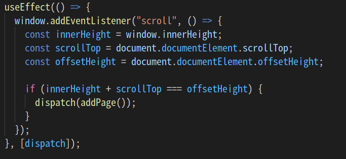 search를 하는 곳에 useEffect를 걸어서 window.innerHeight + documen.documentElement.scrollTo 값이 document.documentElement.offsetHeight 값이 같을 때, dispatch를 이용하여 addPage() 함수가 실행이 된다.