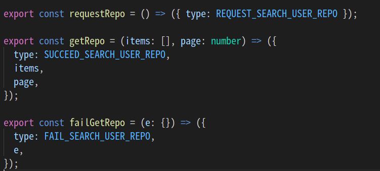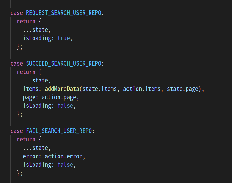 *api 요청이 완료되면 결과가 있다(error 있으면 failGetRepo가 실행이 될것이고, 아니면 getRepo가 실행된다.) 어쨋든 결과가 있기 때문에 isLoading값을 false로 바꿔주고, error든 data든 reducer에서 값을 넣어준다.
