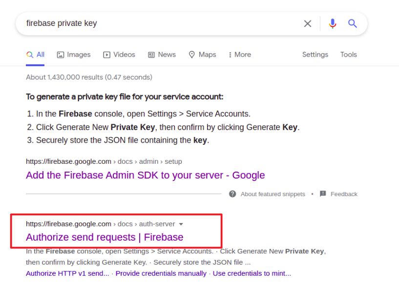 firebase private key 페이지를 찾았던 방법은 firebase private key를 검색을 하고 빨간색으로 표시된 곳으로 들어간다.