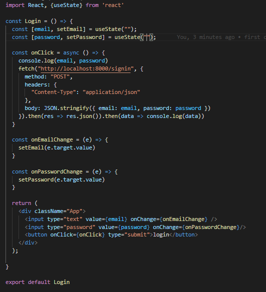 email 입력란 password 입력란 2개의 input을 만들고 거기에 들어온 문자를 fetch를 통해서 server 보내려고 한다.