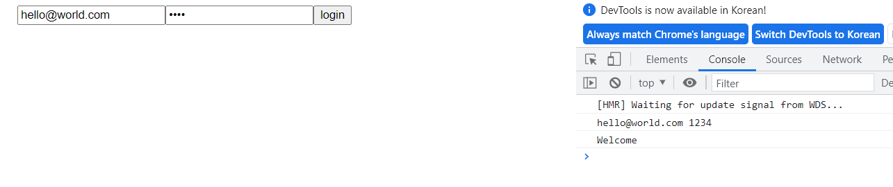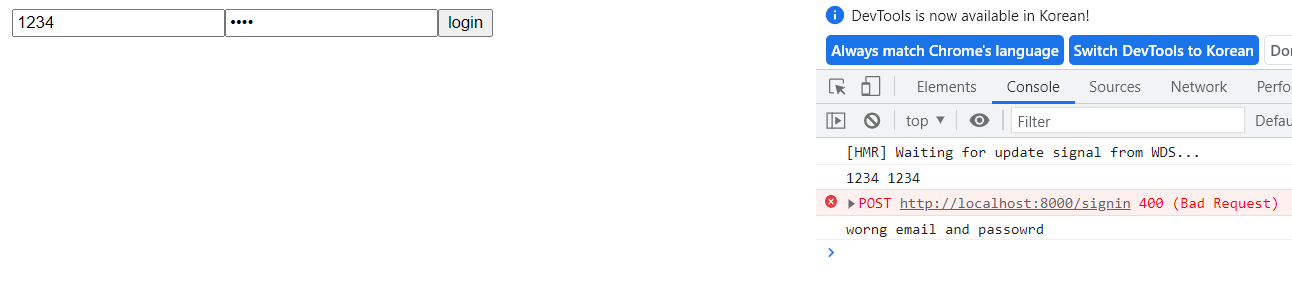 Node server에서 가장 중요한 것중에 하나는 error가 발생했을 때, 혹은 error를 프론트로 보내주는 코드가 꼭 필요하다. 반응이 없으면 그 이후의 코드들이 실행이 안되고 계속 기다린다. res를 return으로 돌려주는 코드를 추가했다. email이 hello@world.com 이고 password가 1234 일 때, welcome을 프론트 엔드로 보내주고 아니면 wordng email and password를 보내 준다. 위에 프론트엔드 코드를 보면 받은 메세지를 로그를 찍도록 했기 때문에 크롬 콘솔에서 확인이 가능하다.