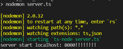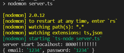 이전에 만들어 놓은 server.ts를 켜서 email과 password가 잘 들어오는지 확인 하려고 한다. npm start로 서버를 켠다