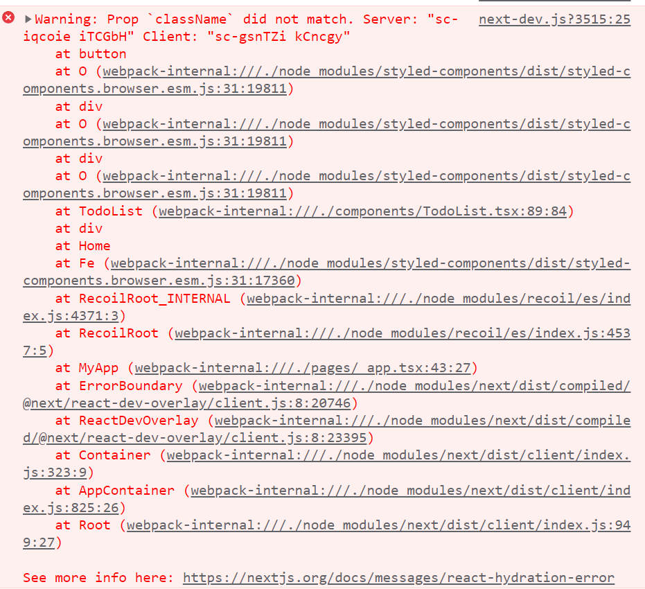next js에서 styled components를 바로 적용한다면 다음과 같은 error가 발생한다. 이유는 SSR을 하는 next.js가 syled component를 먼저 못 읽어서 발생하는 문제이다.