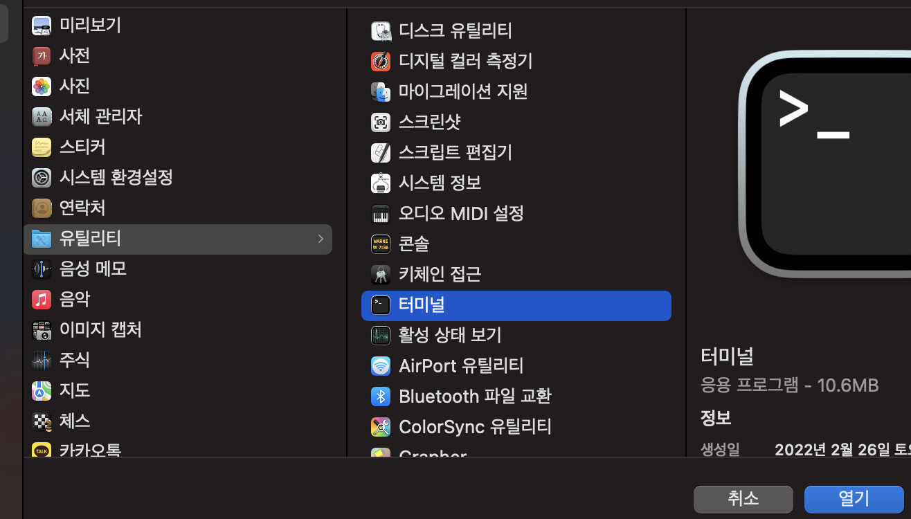 * 유틸리티 > terminal을 선택을 하고 열기 버튼을 누른다.