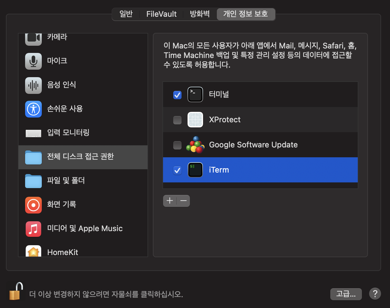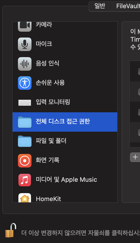 * 전체 디스크 접근 권한 으로 가서 + 버튼을 누른다.
