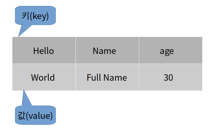 -객체는 index 대신 key라고 불리는 값을 대신 사용한다.(하단 표를 보면 index에 괄호가 있다. 배열과 다름)