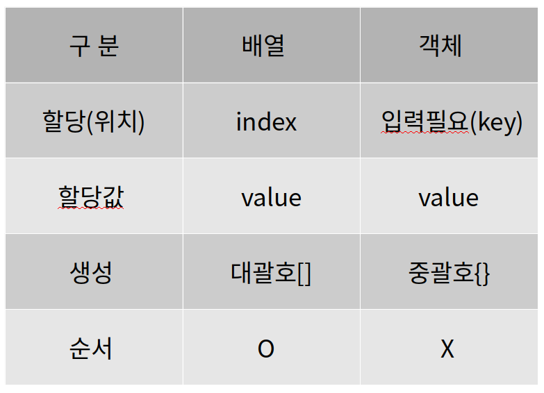 - 객체와 배열의 차이점은 하기 표2와 같다.