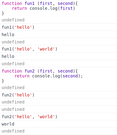 - fun2 함수에서 매개변수 second만 사용 했기 때문에, 함수 호출 시 1개의 인자만 호출 하면 undefined가 출력된다.