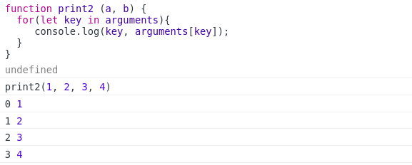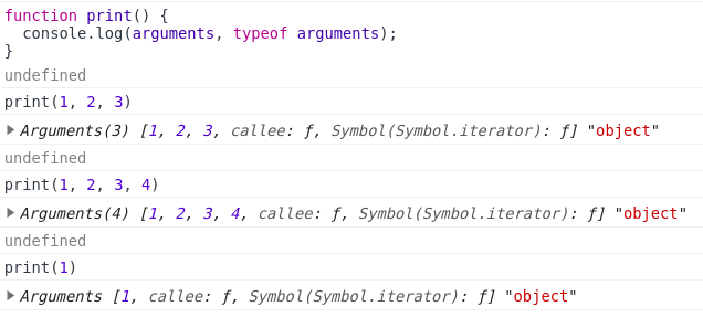 arguments는 함수에 들어오는 argument(인자)처럼 들어온다. 이전 함수라는 글에서 함수에 들어오는 argument(인자)와 함수내에서 사용하는 변수의 개수가 맞지 않을 때, 사용하면 좋은 기능이다.