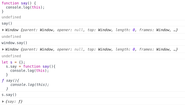 *이때 this는 window를 가르키고 있다. 그 이유는 say라는 함수는 window라는 전역객체에 할당 되어 있기 때문이다.