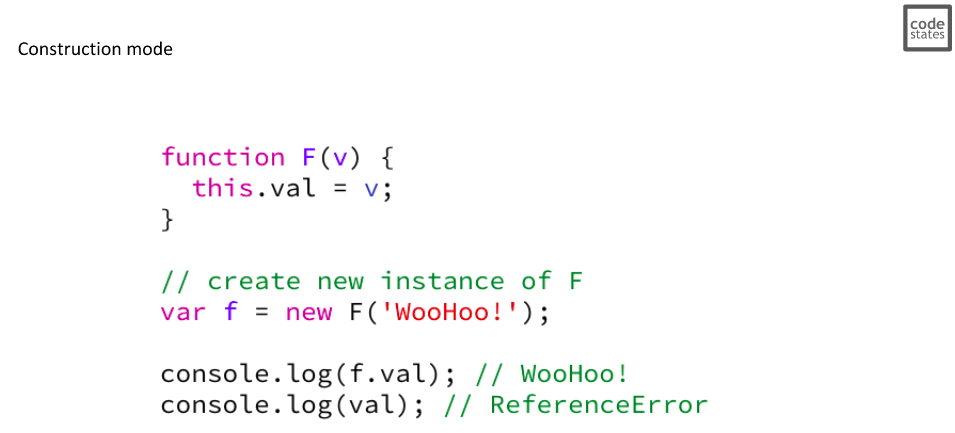 4. Construction mode(new 연산자로 생성된 function 영역의 this) : 새로 생성된 객체