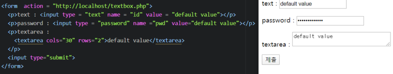 *default value는 type textbox와 다르게 태그 밖에 넣어야 하며, web을 처음 켰을 때, textbox에 들어가 있음(클릭시 지워지지 않음)