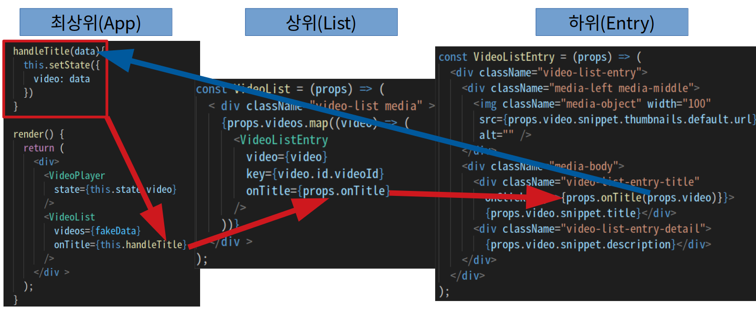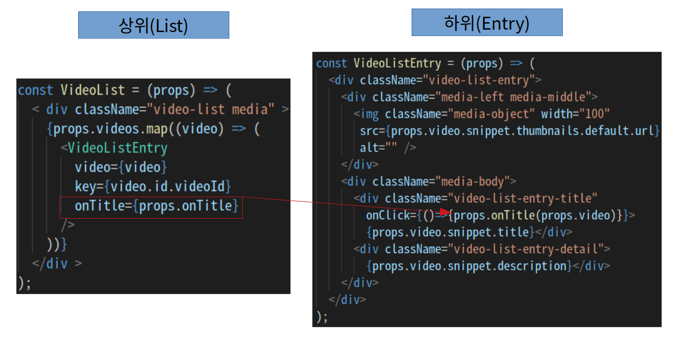 *하위(List)에서 상위로 부터 받은 메소드 이기 때문에 props 객체로 전달이 되고, 이것을 onTitle 할당해서 VidoeListEntry에 전달을 한다.