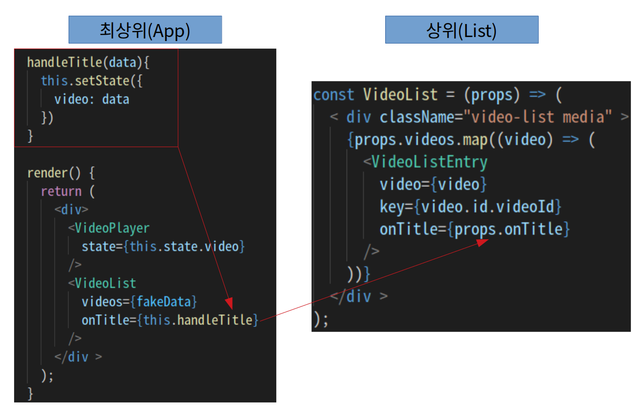 *handleTitle 메소드를 VideoList 컴포넌트를 통해서 하위로 전달한다.