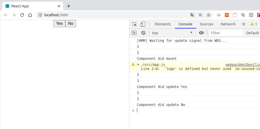 console을 확인 해보면 1이 2번 찍히고 componentDidMount가 되고, click을 누르면 componentDidupdate가 실행된다.