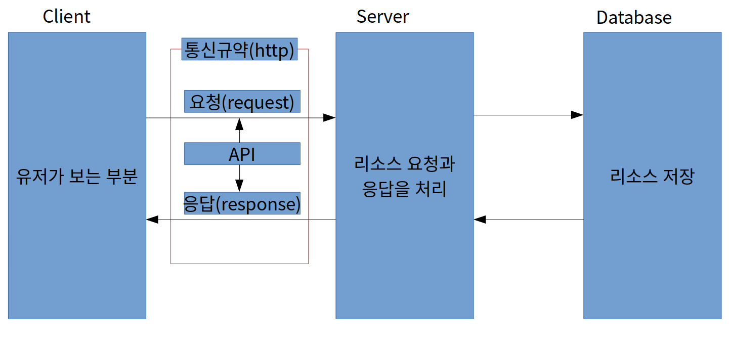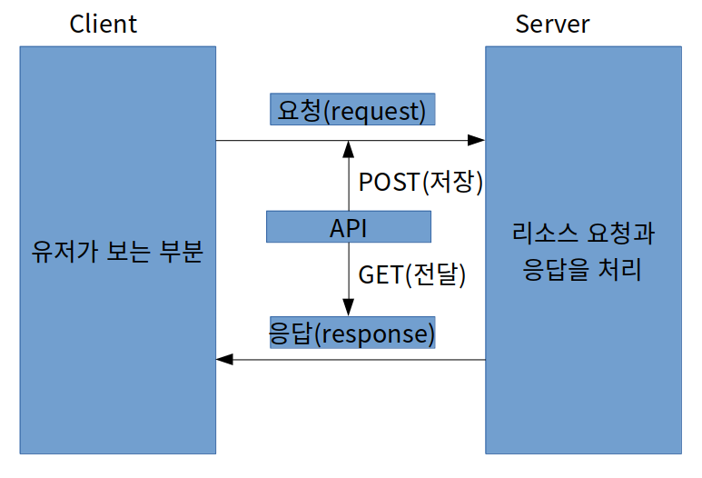 Client가 요청을 전달 받을 때 API로 GET. client 요청을 server가 저장 할 때 POST를 사용한다. client가 get 요청을 하면 서버는 DB로 부터 data를 받아오고 post 요청을 하면 서버는 database에 새로운 data를 저장한다.