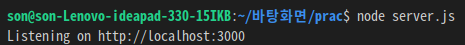 이 코드를 작성한 후, node를 이용해서 terminal에서 실행을 해보면 아래 사진과 같이 server가 실행 되었다.