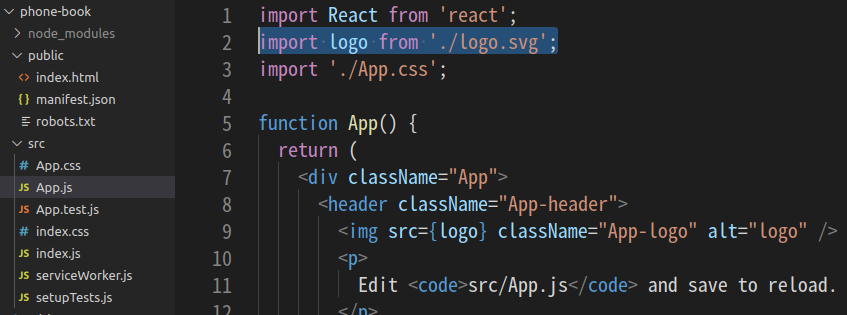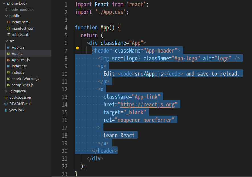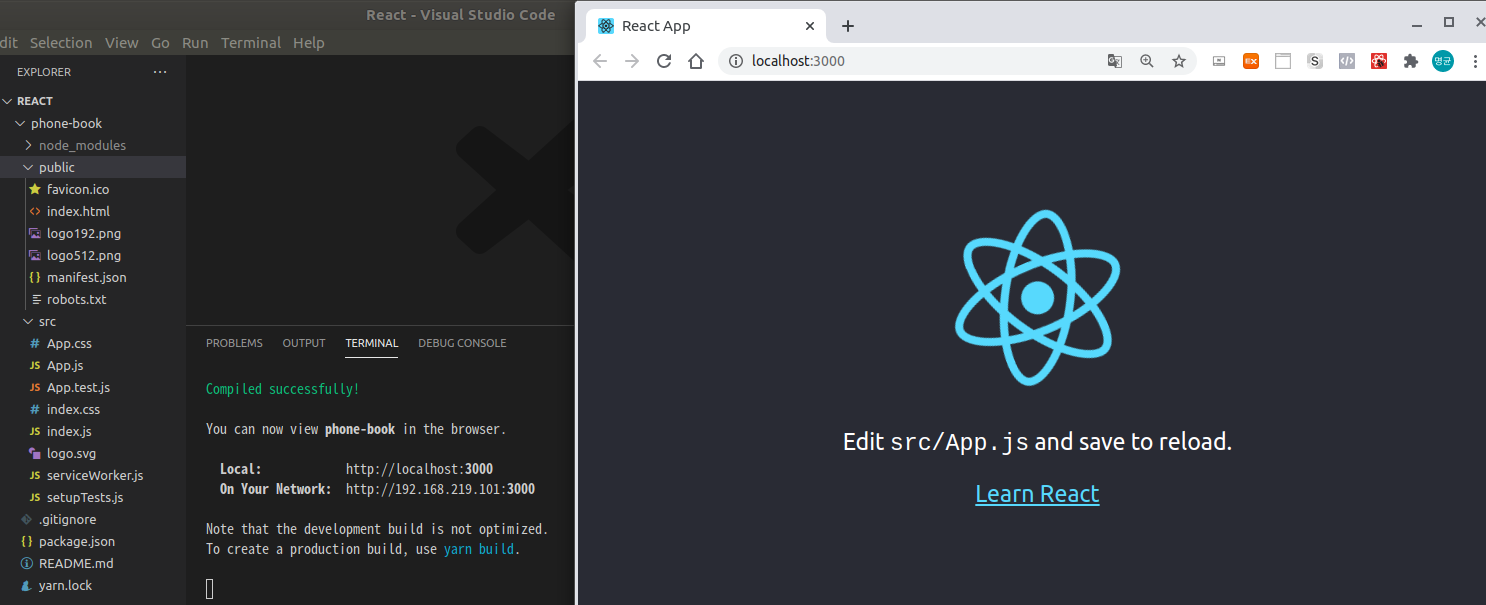 그 다음 phone-book 폴더로 이동해서 yarn start를 하게되면 react 제공하는 기본적인 웹이 실행이 되며 프로그램 도구(개인적으로 vs code 사용)에 파일들이 생성된것을 확인 할 수 있다.
