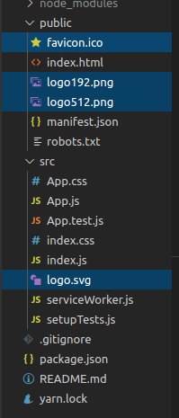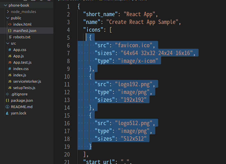 그리고 public 폴더에 있는 manifest.json에서 이미지와 관련된 내용을 삭제를 한다.(블럭 지정된 부분 삭제)
