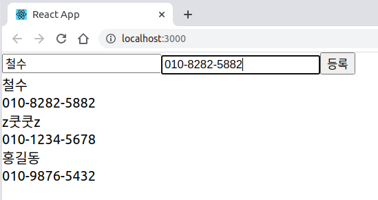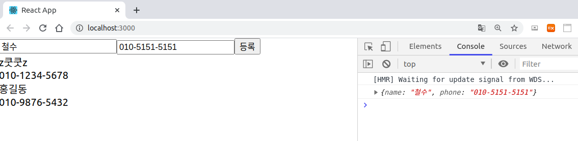 React App에서 이름을 입력하는 input에 값을 넣어주면 바로바로 출력되는 것을 확인 할 수 있다.