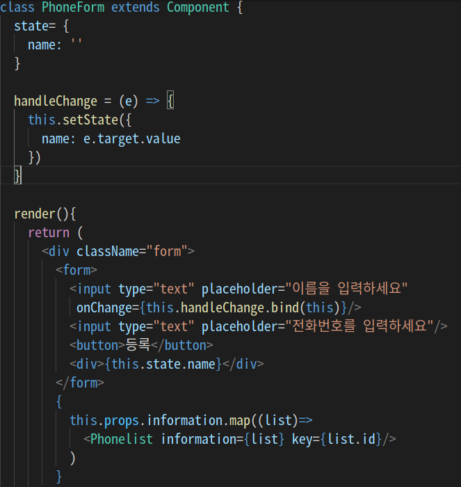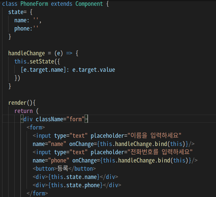 handleChange 함수에 [e.target.name]: e.target.value 로 바꿧고, input 옵션으로 각각 name="name" name="phone" 을 넣었다. 이렇게하면 구조할당분해로 e.target.name값은 이벤트가 발생하는 곳에 name값을 가지고 온다. 즉, 이름 input란에 이벤트가 발생하도록 글자를 입력해주면 e.target.name은 name이고 되고, 폰 input란에 이벤트가 발생하면 e.target.name은 phone이 된다.