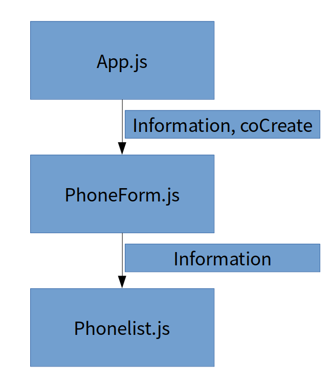 인제 등록 버튼을 눌렀을 때, 데이터를 저장하는 이벤트 넣는 것을 구현해야 한다. 그 전에 현재까지 작성한 component 상하 관계를 살펴 보면 App.js 자식으로 PhoneForm이 있고, PhoneForm 자식으로 Phonelist가 있다.