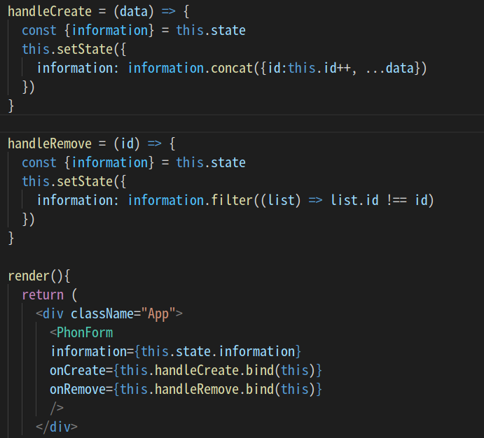 App.js에서 handleCreate 함수에서 매개변수로 받은 data를 state에 추가를 하면된다. 여기서 handleCreate에 이전에 데이터들을 받아온다. 그 이유는 React는 새로 생성 되거나 변경사항이 있으면 렌딩이 다시 되기 때문에 기존의 데이터에는 영향을 주면 안된다. 아직 간단한 예제라서 잘 이해는 안되지만...