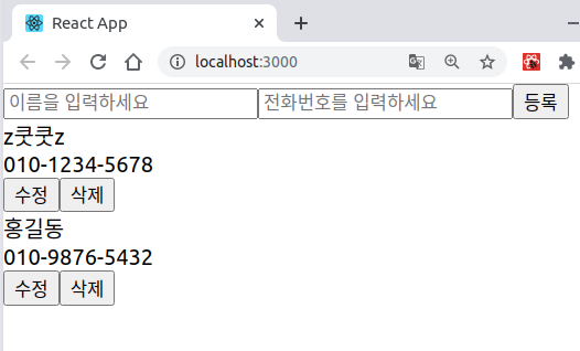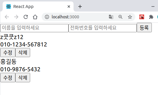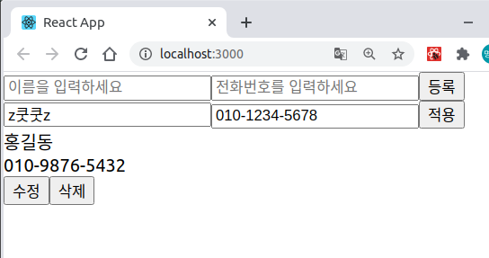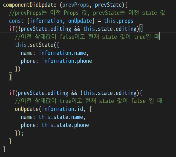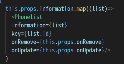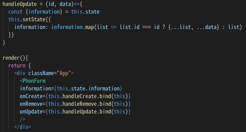 handleUpdate 함수를 만들고 자식 component를 전달한다. setState는 data(information)에 있는 값들의 id와 같으면 새로운 객체에 기존 데이터 ...list(information) 값에 ...data(phonelist에서 받아오는) 값을 덮어 씌운다. 그리고 list.id와 id 값이 다르면 기존의 information를 반환한다. PhoneForm은 함수를 상속 시켜준다.