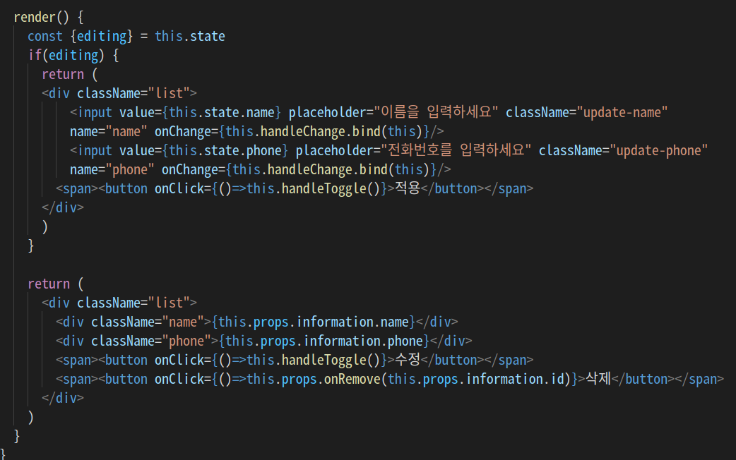 render 메소드의 return 값도 editing의 값에 따라 변한다. editing이 true 즉, 수정버튼을 눌렀을 때이다. 다시 적용버튼을 누르면 editing 값이 false가 되면서 if문 밖의 return 값이 실행 된다.