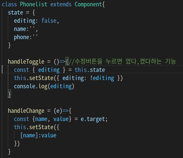 handleToggle 함수는 이미 state값이 false로 할당이 되어있다. 즉, toggle이 꺼짐 상태를 의미한다. handleToggle 함수가 호출되어 작동이 되면 setState로 editing:!editing 이 되면서 states에 있는 editing 값이 true가 된다. !editing은 현재의 값에 반대로 저장한다.
