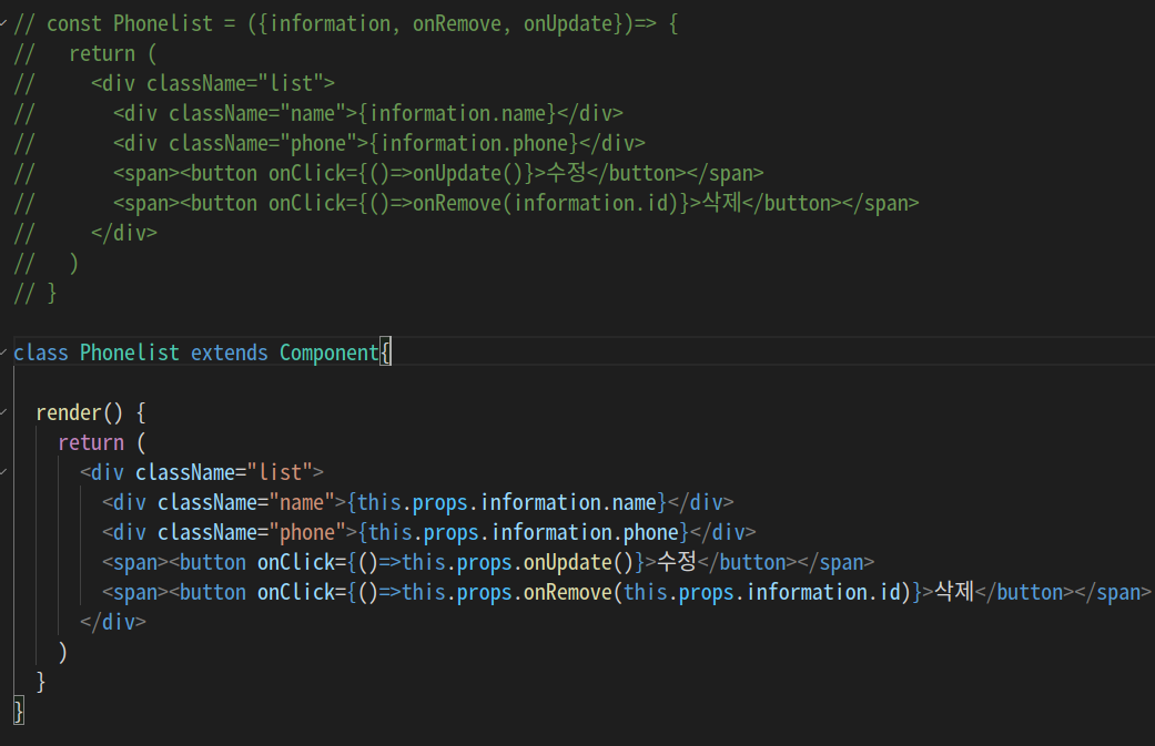 data를 수정하는 기능을 넣으려고 하는데 이전까지 phonelist를 함수형으로 진행했는데, 수정하는 기능은 toggle형태가 필요하고, state 값을 바꿔야 하기때문에 함수형을 class형으로 변환해야한다. 이전까지 작성한 return 이하를 복사해서 class를만들고 render안에 리턴값을 붙여넣는다. 그리고 data를 상속받는 형태로 바꿔준다. 그리고 onUpdate라는 함수를 App.js에서부터 받아올것이다.