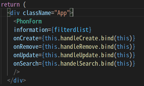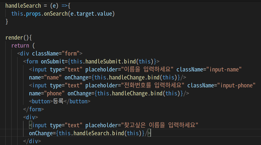 형태를 나타내는 코드는 PhoneForm에 작성을 했기 때문에 PhoneForm에 검색창을 만들었다. 그리고 검색창에서 들어오는 값을 handleSearch에서 받아 주어야 하기 때문에 statelift로 전달을 하면 된다.