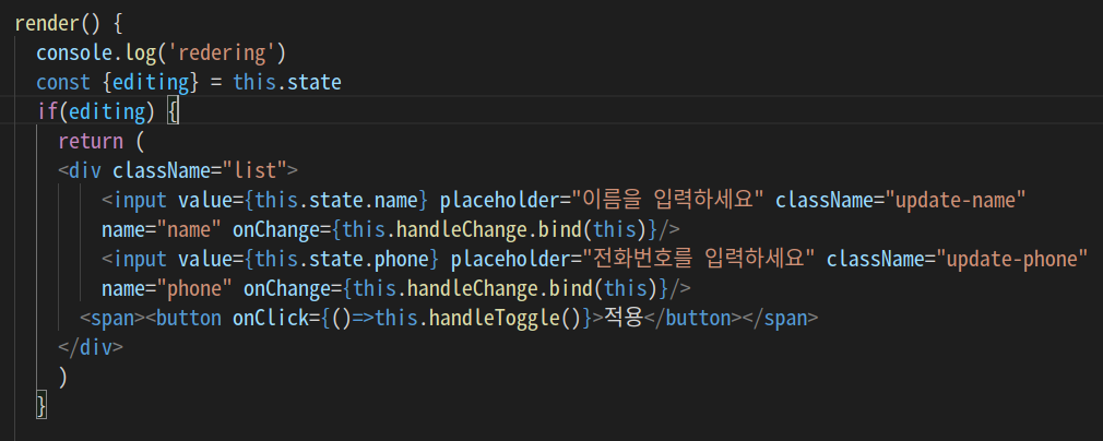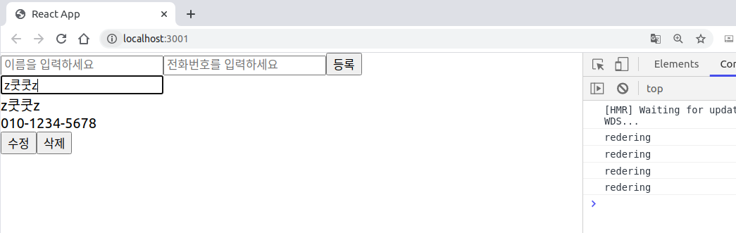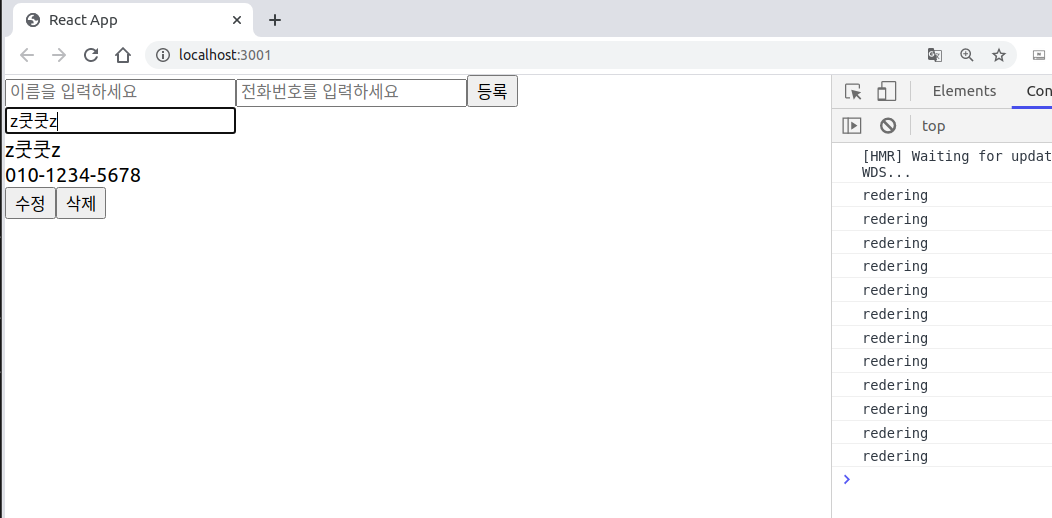 render() 메소드 안에 console.log('rendering') 넣고 입력란에 글자를 입력해보면...console에는 rendering 값들이 많이 늘어 나는 것을 알 수 있다. render가 변하는 값에 따라 계속 render가 되는 것을 확인된다. 그만큼 메모리를 낭비하고 있다.