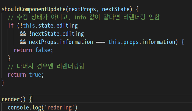 그리고 생명주기 메소드를 사용해서 남용되는(?) 메모리를 줄여주기 위해 shouldComponentUpdate를 사용한다.(아직 생명주기 함수는 너무 어렵다... 봐도 이해가 잘 안되는...)